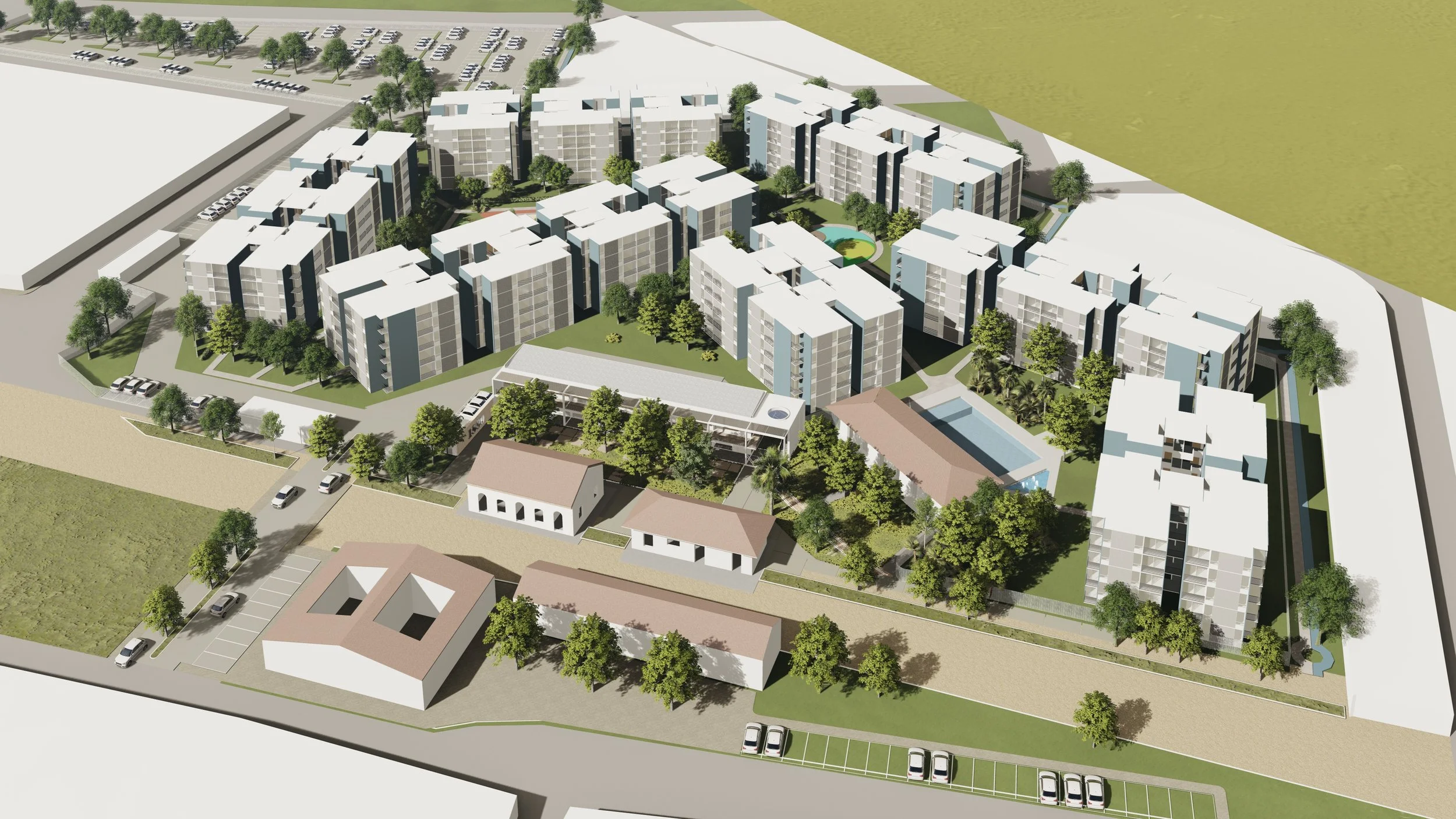 This project is a conversation between the history of Apulo and the needs of a growing community. At its heart sits an antique train station, once a place of passing through, now reimagined as a vibrant social hub. We designed the master plan to wrap modern, affordable housing around this historic landmark, creating a neighborhood that feels both established and new.